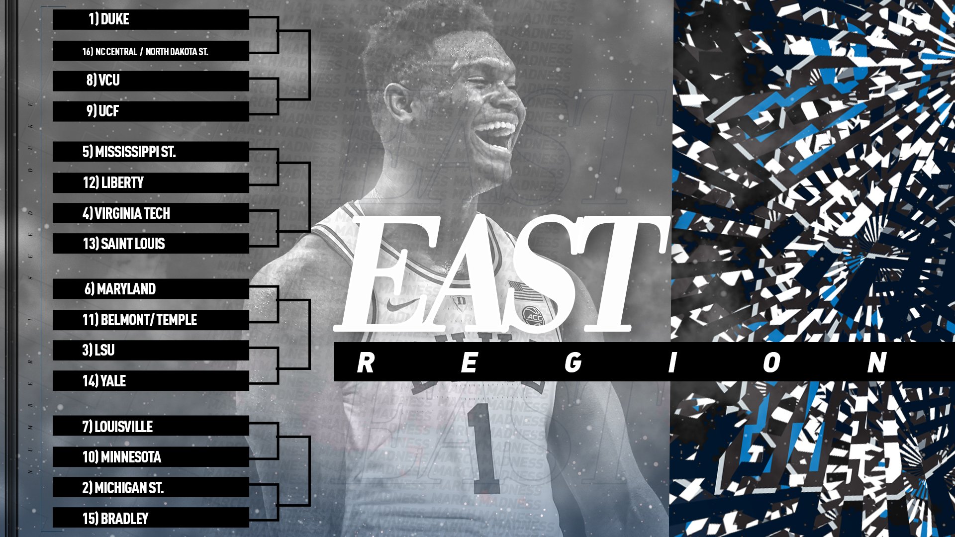 Η φετινή χρονιά είναι λογικά χρονιά των φαβορί, καθώς και σε αυτό το bracket το #1 δείχνει να μην έχει αντίπαλο. Ειδικά αφού μιλάμε και για την ομάδα του φαινομένου “Zion Williamson”. Το Duke, λοιπόν, που μαζί με το πρώτο pick του Draft του 2019, έχει και τους Barrett και Reddish, δημιουργώντας μια τριάδα-φόβητρο, που θα χρειαστεί τεράστια προσπάθεια από κάθε υποψήφιο αντίπαλο θα προσπαθήσει να τους πετάξει εκτός Final 4.